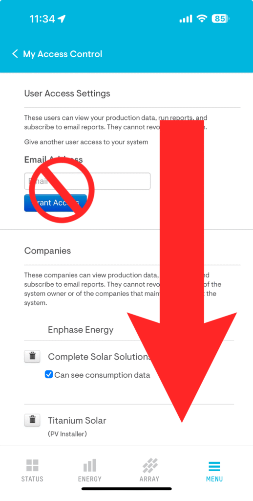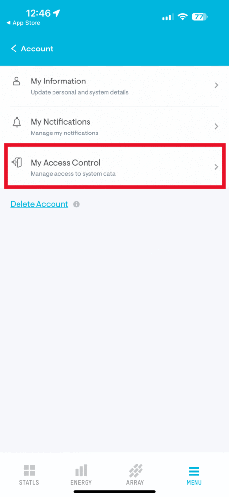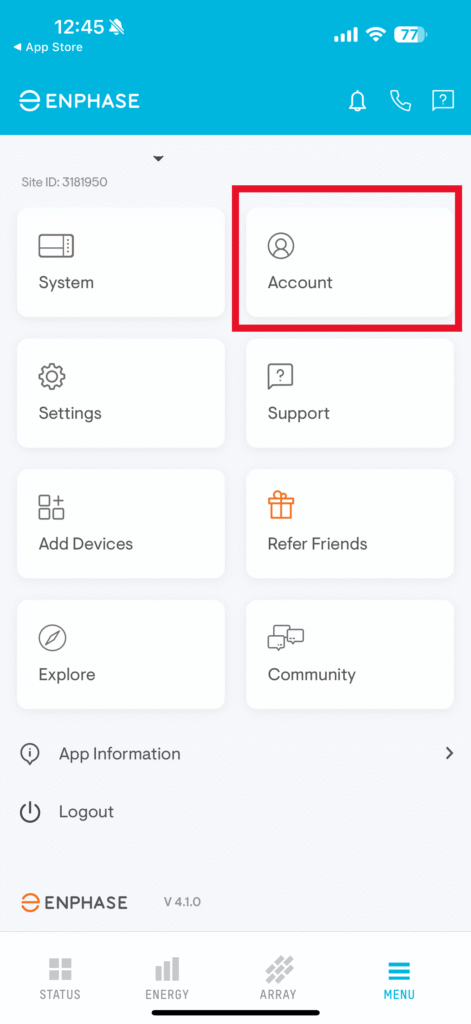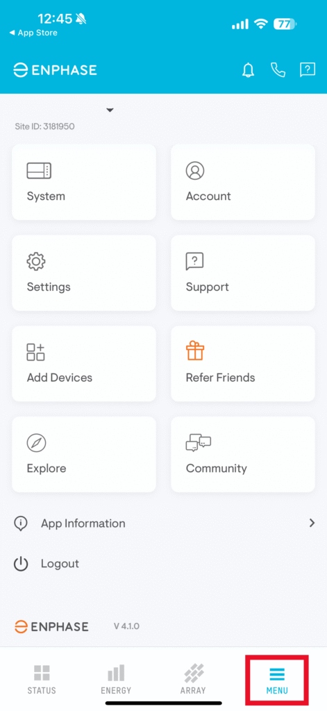 Step 1: Login to you Enphase Enlighten App and click on “Menu” in the bottom right.