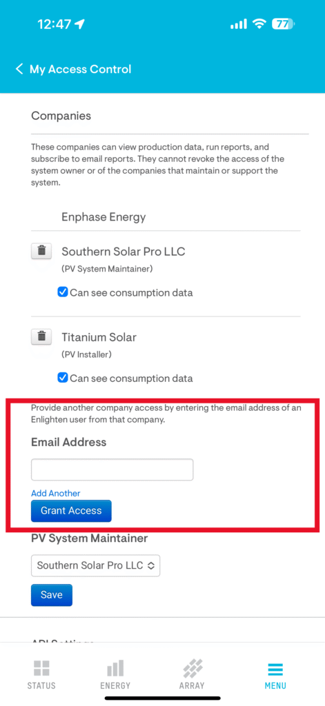 Step 5: Add kasey@completesolarsolutions.com as the email address under companies and click Grant Access.